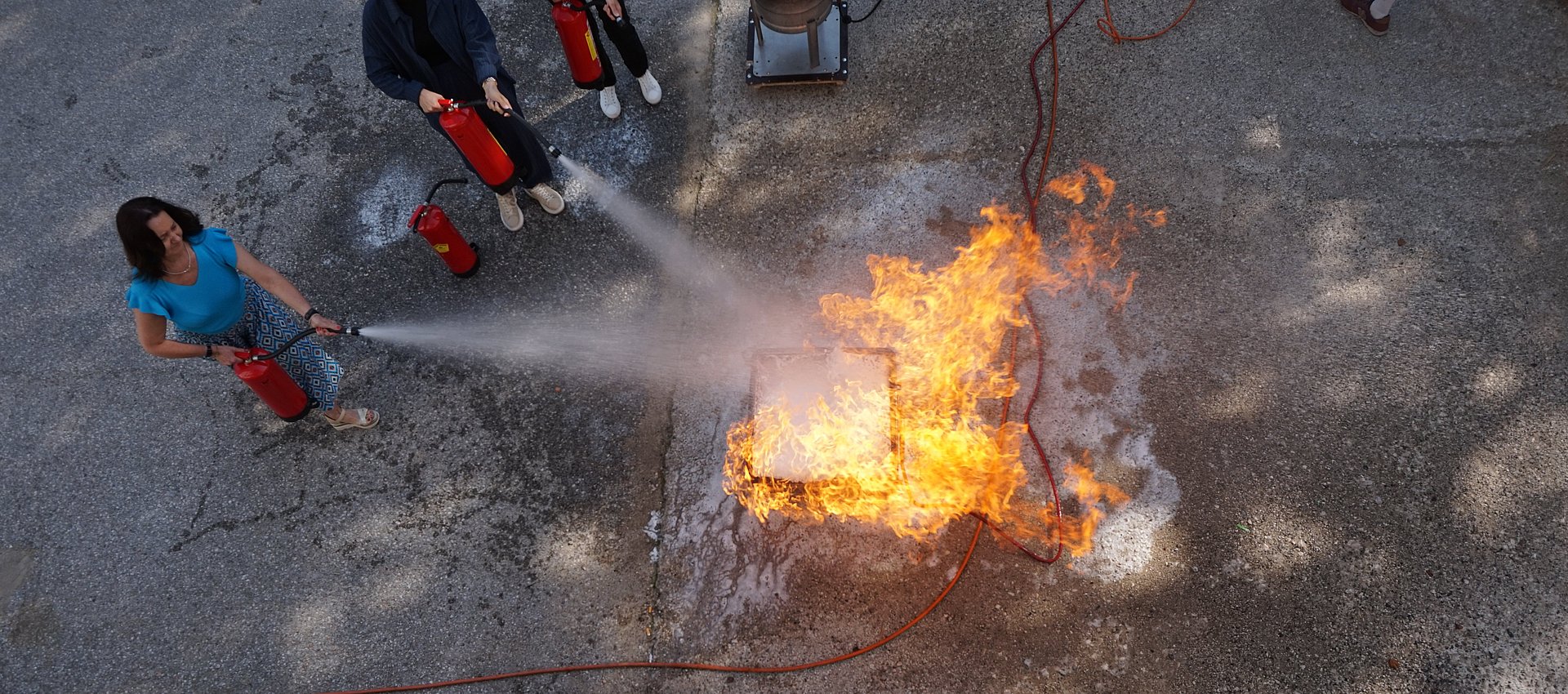 - Praktische Übung am Brandsimulator mit tragbaren Feuerlöschern (Wasser-, Schaum-, CO²-, Fettbrand- und Pulverlöschgeräten)